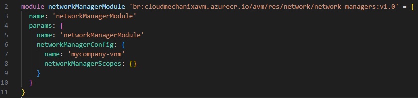 module networkManagerModule 'br:cloudmechanixavm.azurecr.io/avm/res/network/network-managers:v1.0' = {
